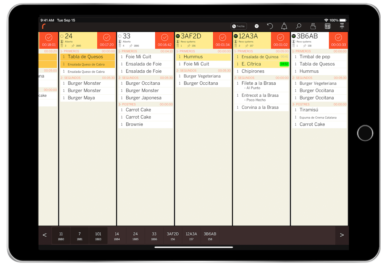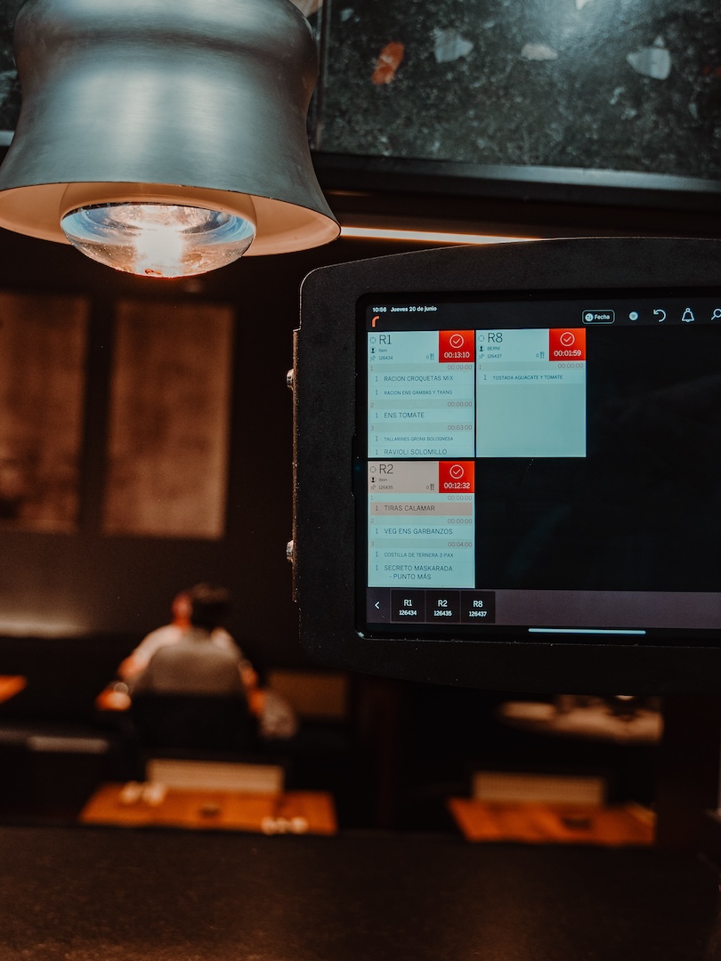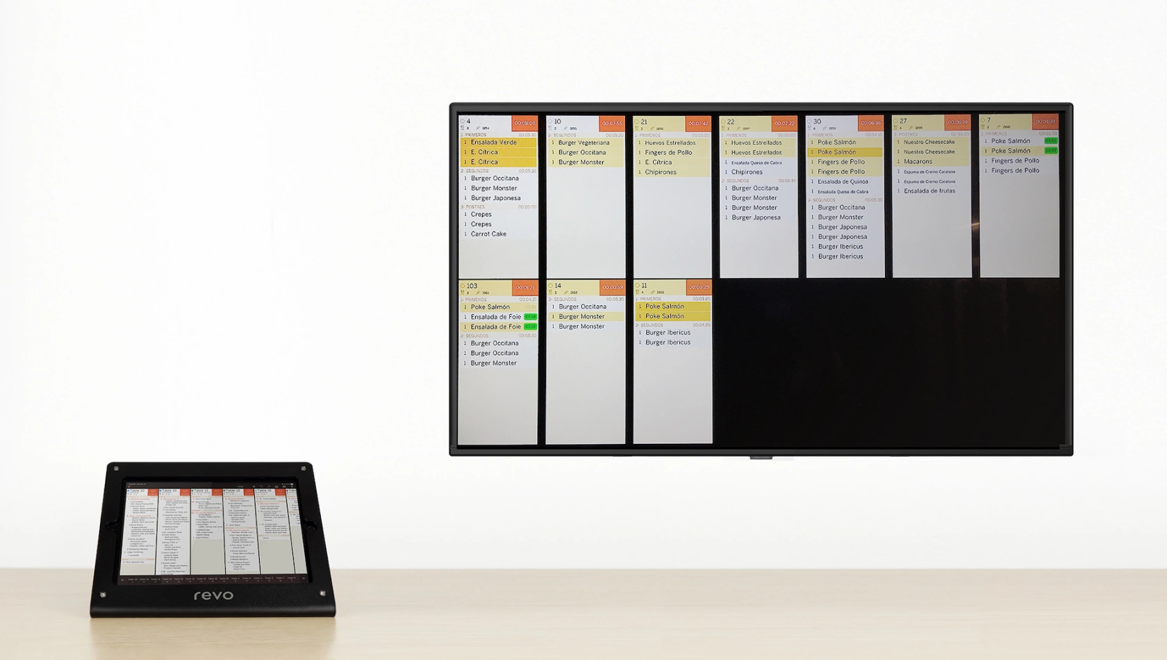 Nuestro servicio de gestión de cocina optimiza la comunicación entre sala y cocina, mejorando el flujo de trabajo. Con Revo KDS, visualizas pedidos de forma clara, distinguiendo entre pendientes, en progreso y preparados. Personaliza la visualización, amplía la información con una segunda pantalla, y mantén informados a tus clientes sobre el estado de sus pedidos. Además, los empleados pueden fichar desde el KDS, y un KDS central te permite coordinar las tareas eficientemente, mejorando la experiencia en tu restaurante.